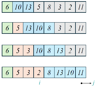 i记录有序段的长度,a[i]是待排序元素,迭代前有序段已有序,迭代后有序段有序、且长度加一。