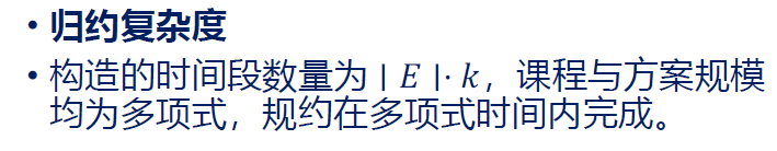课程安排问题很显然是NP的,对每门课程 ,收集其所选方案的所有时间段,可以在多项式时间内验证时间段是否有重合。- 规约