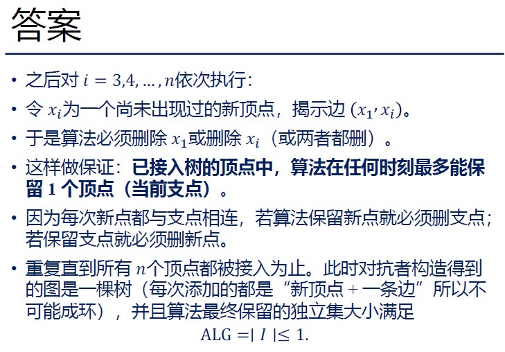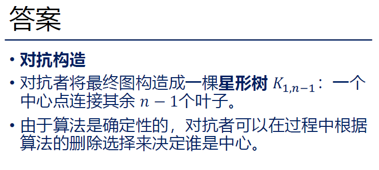 - 对抗者发现算法总是保留 1,删掉新点。 那么对抗者可以继续用同样的方式:给边 (1,4)、(1,5),每次都逼算法删掉 4 或 5,算法如果总保留 1,最后 I={1}。这样就成功了:最终图是 星形树,中心是 1,所有叶子 2,3,4,5 都被删掉了。算法最终只剩 1 个点。