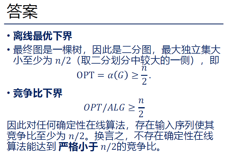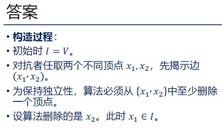 - 对抗者随意选两个点,比如 A_1=1 和 A_2=2,给边 (1,2)。 算法必须删掉 1 或 2。假设算法删了 2,现在 I={1,3,4,5}。